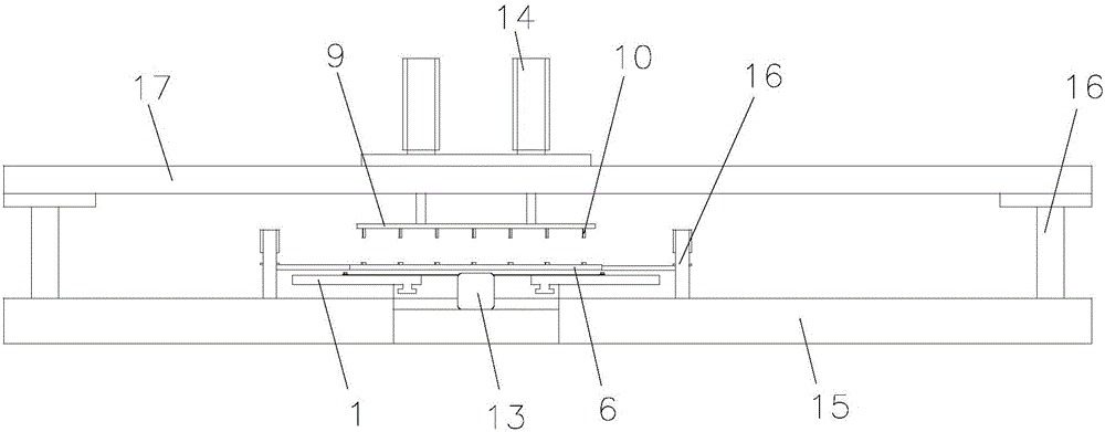 所述底座15上通過支架16固定安裝一條橫梁17,橫梁17上固定安裝升降氣缸14,升降氣缸14的伸出端與如圖7所示的壓板9固定連接,壓板9位于導(dǎo)向板6的正上方,所述壓板9上固定安裝有若干與石墨舟18上的工藝孔相對應(yīng)的壓桿10,所述壓桿10與所述導(dǎo)向套筒8同軸心。